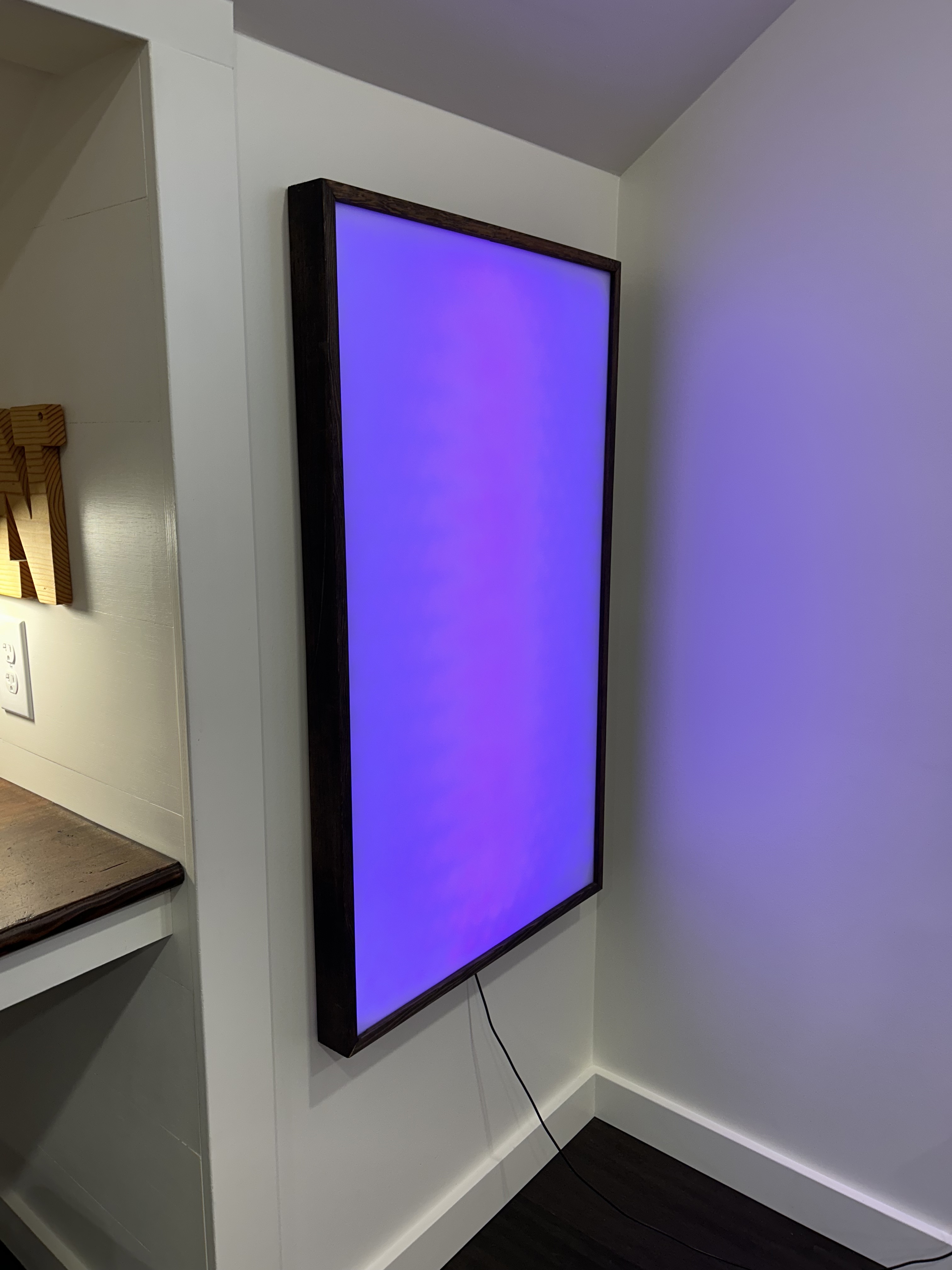 Bobby the Lamp is an interactive art display that demonstrates the unity of the internet. Bobby is an LED color-changing panel that can be changed to any color, from any location, by any person. While the world may feel huge, the goal of this project is to demonstrate how the network of computers that we call the internet can help make us more interconnected. “Bobby” has 600 individual LEDs, a central control box that handles all of the incoming web requests, a two-foot by four-foot frame, and a 1.5-millimeter polycarbonate diffuser that creates the glowing effect from the panel once a request is received. The panel is located in my home.
